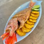 Pargo rojo al vapor o frito con salsa chimichurri.
