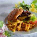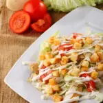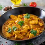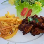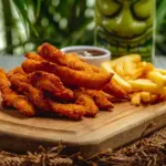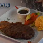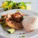 Puré de plátano con tiras de pollo a la parrilla con salsa de tomate criolla o salsa de crema de vino blanco.