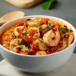 Arroz cocinado con gambas, caracoles, camarones, mejillones, almejas, pulpo, con una rodaja de azafrán.