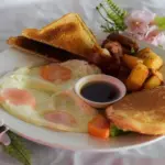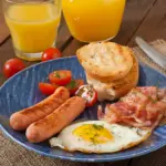 Huevos al gusto, 2 tiras de tocino o salchichas con papas salteadas y rebanadas de pan tostado. Miel o mermelada de su elección.