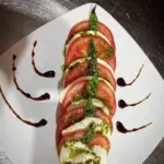 Tomate en rodajas, queso bocconcini y salsa pesto.