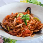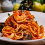 Pasta linguini cocinada con camarones, langostinos, mejillones, almejas, calamares en salsa de tomate rojo o salsa de crema de vino blanco.