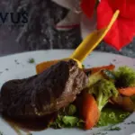 Cocinado a la perfección, servido con una reducción de vino tinto.