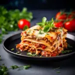 Verduras de temporada, láminas de pasta, salsa de tomate, queso mozzarella y queso parmesano.