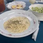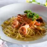 Pasta fettuccini cocida con camarones, espinacas en salsa de crema de vino blanco.