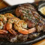8ONZ de filete de rez y gambas en una reduccion de vino Tinto y salsa de limon y ajo.