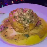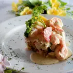 Plátano machacado, camarones salteados cocidos en salsa criolla de tomate o salsa de crema de vino blanco.