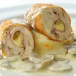Relleno de jamón, queso y pesto cubierto con salsa de vino blanco.