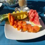 3 Pancakes decorados con frutas tropicales acompañado de su eleccion de miel, mermelada o nutella.