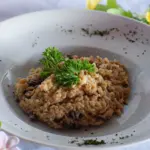 Risotto cocinado en vino blanco con champiñones, cubierto con un filete de falda a la parrilla y queso parmesano.