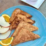 3 Rebanadas de tostadas francesas acompañadas de miel y mermelada.