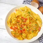 2 Huevos, cebolla, pimiento verde, tomate y queso. Servido con papas salteadas.